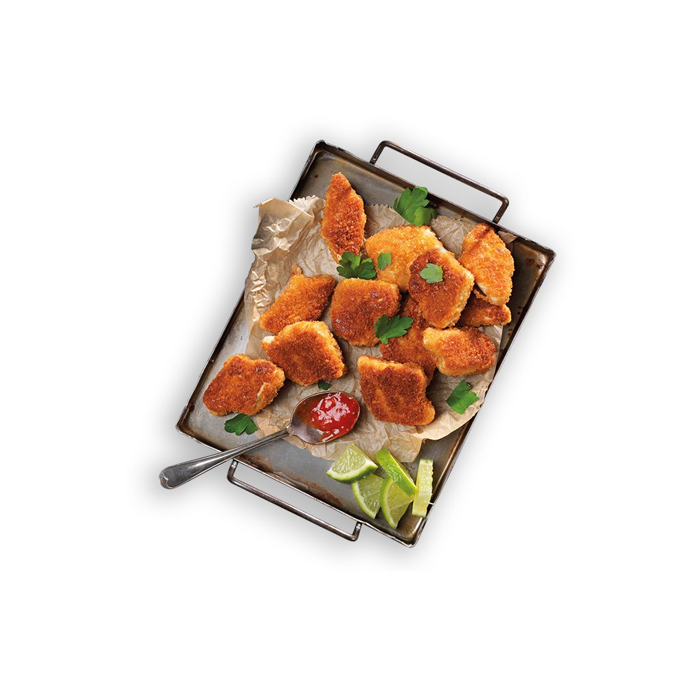 Eau, protéines de SOJA 19%, farine de FROMENT, cornflakes (maïs, sucre, sel de cuisine, extrait de malt d'ORGE), huiles végétales (colza, tournesol), arômes naturels, protéines de pois, sel de cuisine, amidon de pommes de terre, maltodextrine, épices, fibres de pois, farine de riz, amidon de BLE, levure, glucose, extrait d'épices, amidon modifié: E1404 et E1412 (contient de BLE), vitamine B12 (cyanocobalamine), fer (pyrophosphate de fer), colorant: E171.