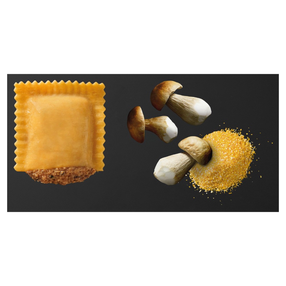 Pâtes aux oeufs, farcies au Mascarpone, cèpes et semoule de maïs 60%.